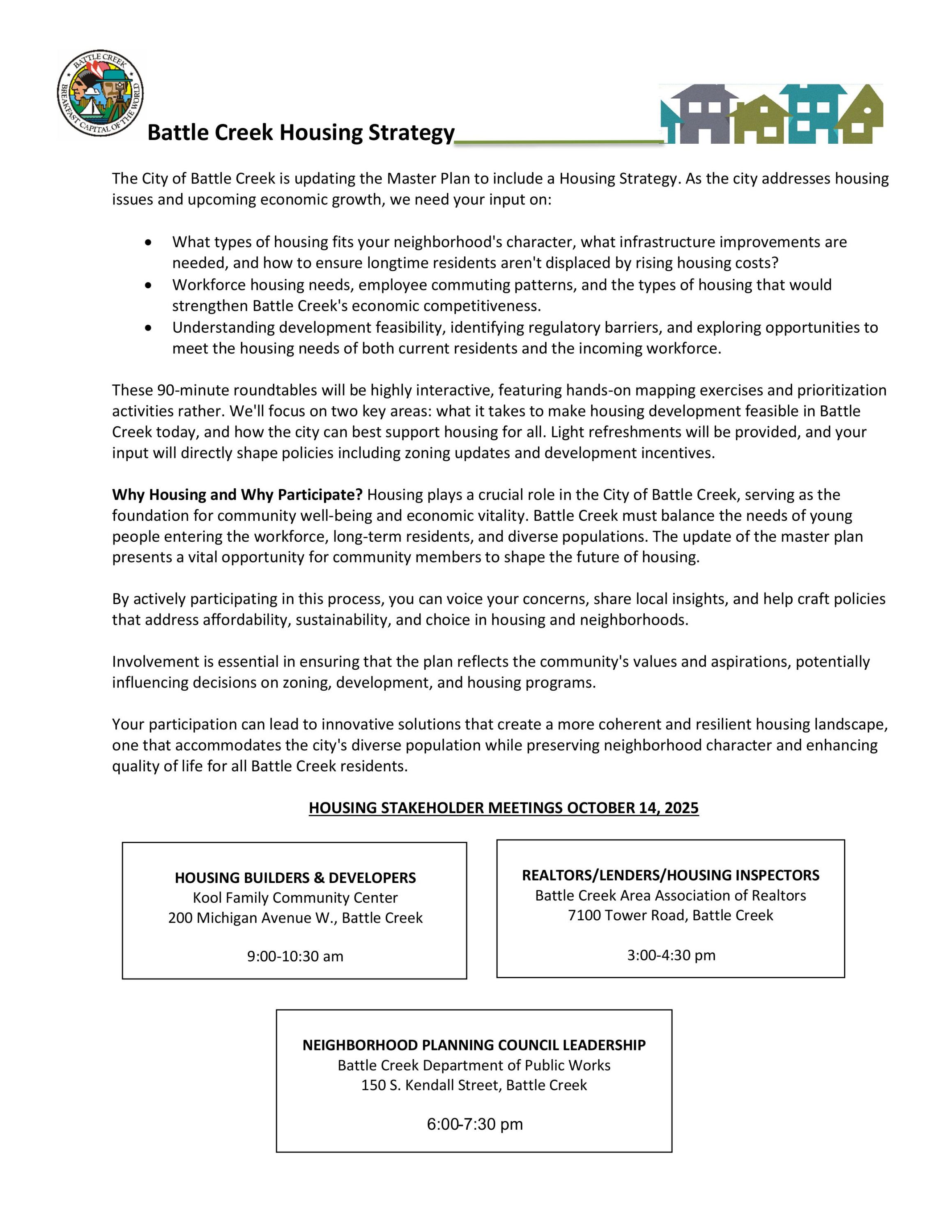 Your participation can lead to innovative solutions that create a more coherent and resilient housing landscape, one that accommodates the city's diverse population while preserving neighborhood character and enhancing quality of life for all Battle Creek residents.